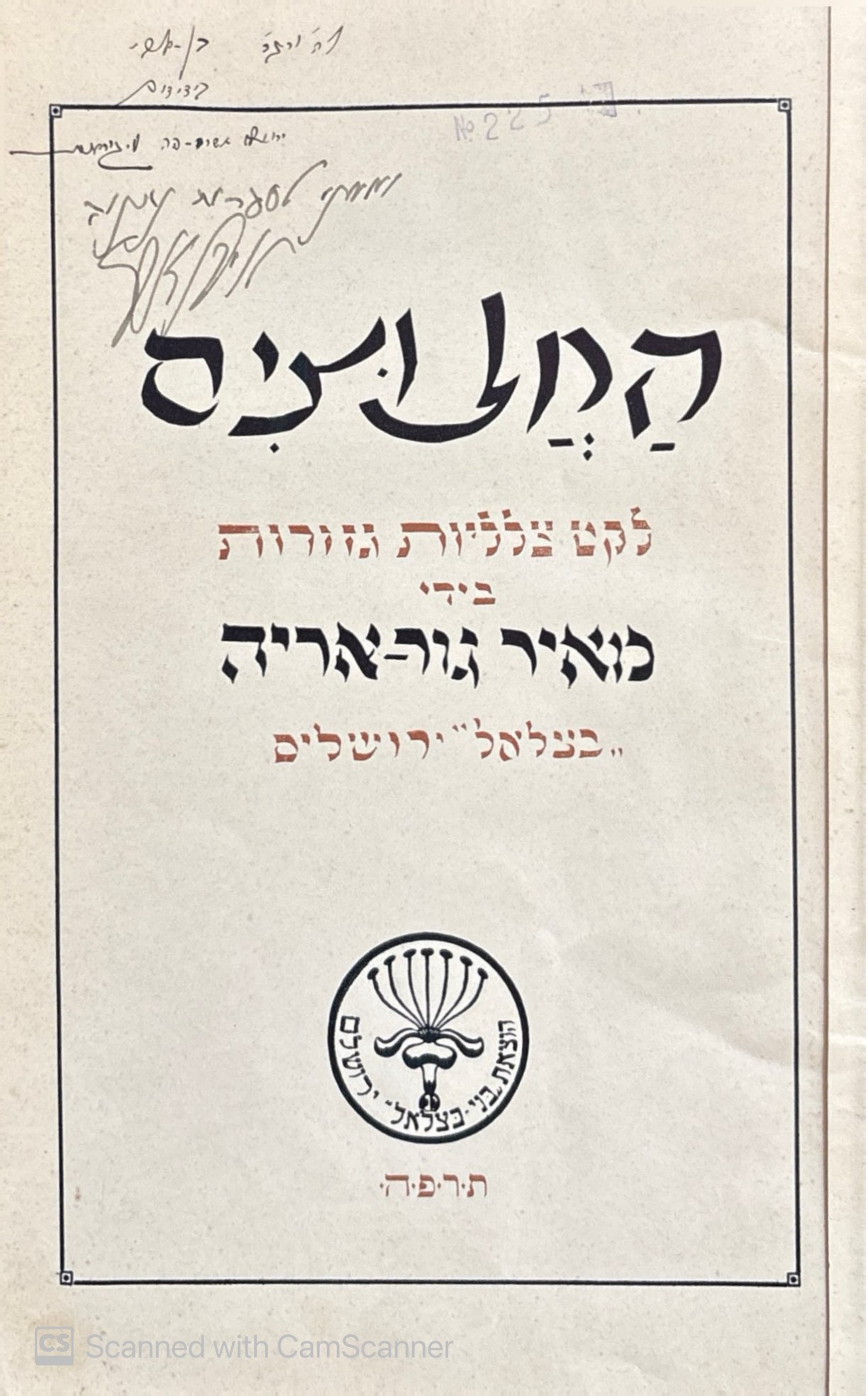 מאיר גור אריה היה מחשובי הציירים והאומנים שיצאו מבית הספר בצלאל. בין השירים: אין דבר, אין דבר ; כשחלוץ... ; מחצבה ואחרים. אוטוגרף חתום לאיתמר בן אב"י בנו של אליעזר בן יהודה. בשל כך ידוע כ"ילד העברי הראשון". הקדשה בכתב ידו של איתמר בן אב"י לספריה העירונית נתניה! כללית מצב טוב.